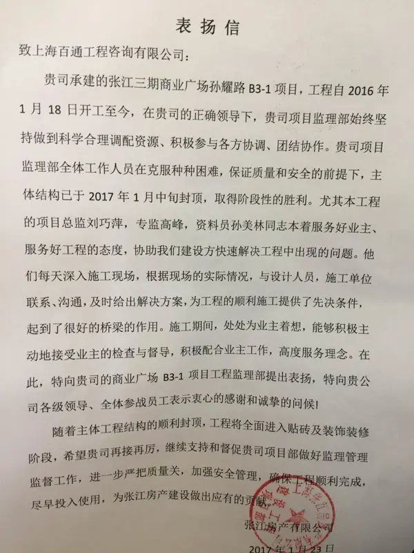 我司监理的张江三期商业广场孙耀路B3-1项目监理部近日收到业主方表扬信。信中表扬了由刘巧萍总监带领的监理项目部,自项目2016年1月开工以来,严格履行监理职责,强化监理服务意识,积极协调各方关系,及时解决工程中出现的问题,严把质量、安全两道关,现场监理工作表现突出,成绩显著(尤其提到工作表现突出的总监刘巧萍、专监高峰、资料员孙美林三位同志),特向我司张江商业广场B3-1项目监理部提出表扬。