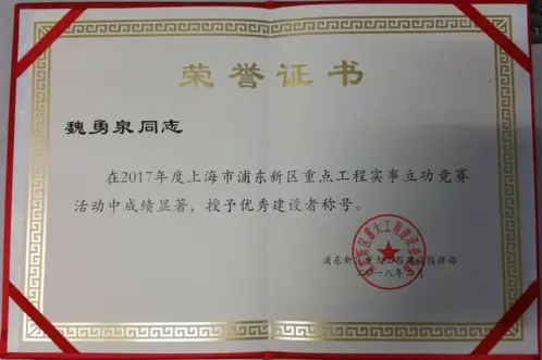 监理部杨高路(世纪大道~浦电路)道路改建工程2标段总监魏勇泉同志,在2017年度上海市浦东新区重点工程实事立功竞赛活动中成绩显著,获浦东新区重大工程建设指挥部授予 “优秀建设者”荣誉称号。