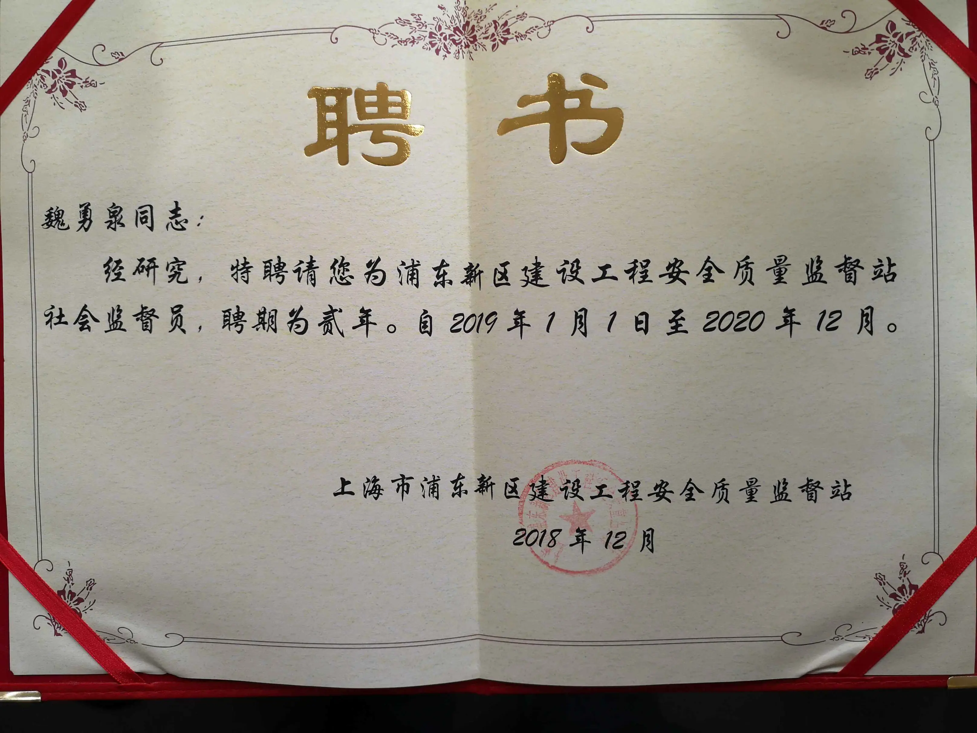 近日,监理部总工魏勇泉同志,被浦东新区建设工程安全质量监督站特聘为社会监督员。