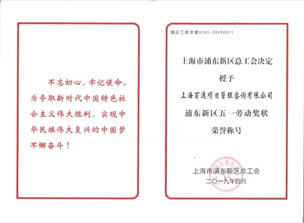 在市区历届“五一”表彰中,我司总工程师邹建文同志曾获上海市“五一劳动奖章”、造价部计量中心曾获浦东新区“工人先锋号”荣誉称号。荣誉代表过去,公司工会在此号召和倡议:百通全体员工携手努力往前更进一步,把奖状视作更沉甸甸的使命责任,把荣誉化为创先争优的不竭动力,让我们不断在工作中做出新成绩新贡献,让奖状奖章永远熠熠生辉!