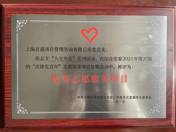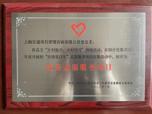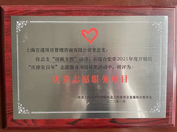 近日,在中共上海市浦东新区社会工作委员会直属综合委员会开展的2021年度“庆建党百年”志愿服务项目征集活动中,我司积极投身参与的“乡村振兴,企村结对”捐助活动、“援藏支教”活动、“人文关爱”系列活动等三项公益活动,被评为“优秀志愿服务项目”。