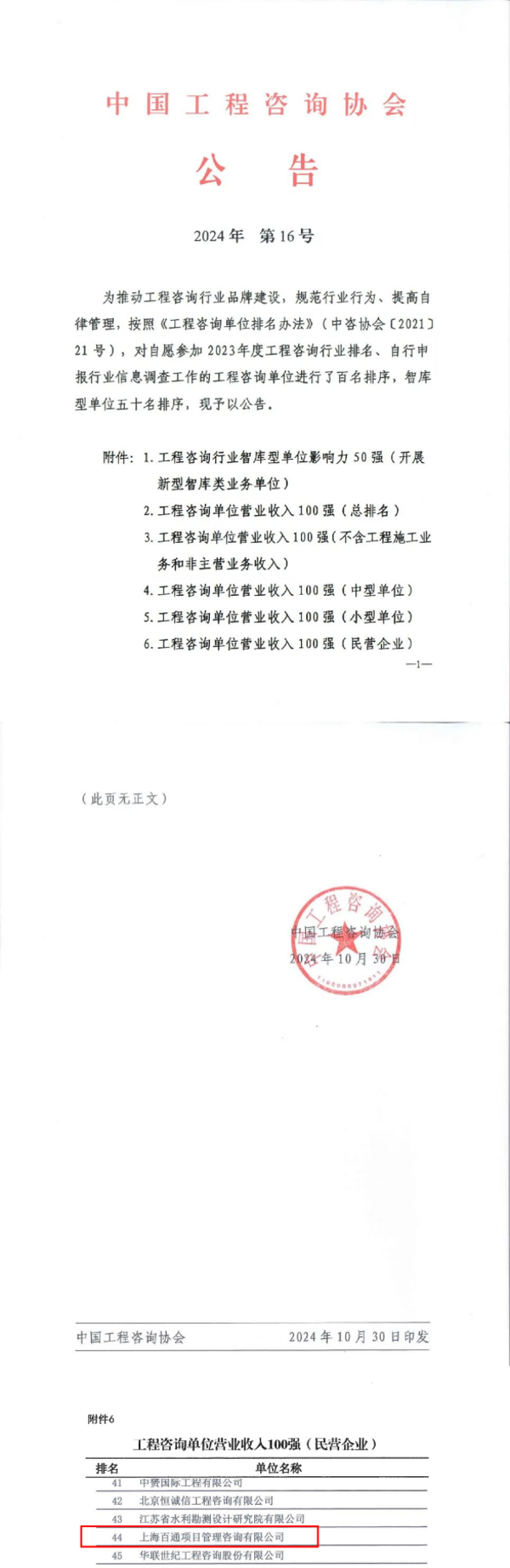 在此次权威排名中,我司凭借卓越的专业实力、丰富的项目经验和优质的服务质量,成功入围2023年工程咨询单位全国民营企业营业收入百强,并荣列第44位。这一荣誉不仅是对我司长期以来在工程咨询领域辛勤耕耘和不懈努力的肯定,更是对我司深厚底蕴和广泛影响力的有力证明。