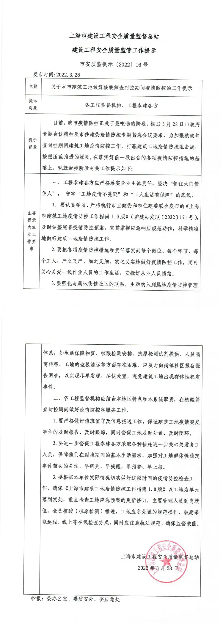 市安质监提示〔2022〕16 号《关于本市建筑工地做好核酸筛查期间疫情防控的工作提示》