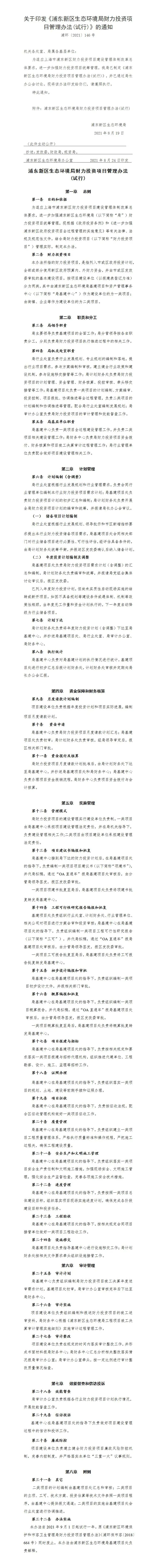 关于印发《浦东新区生态环境局财力投资项目管理办法(试行)》的通知【浦环【2021】146号】