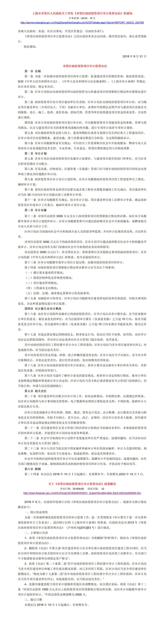 [奉贤]关于印发《奉贤区政府投资项目审计监督办法》的通知【沪奉府规〔2018〕15号】