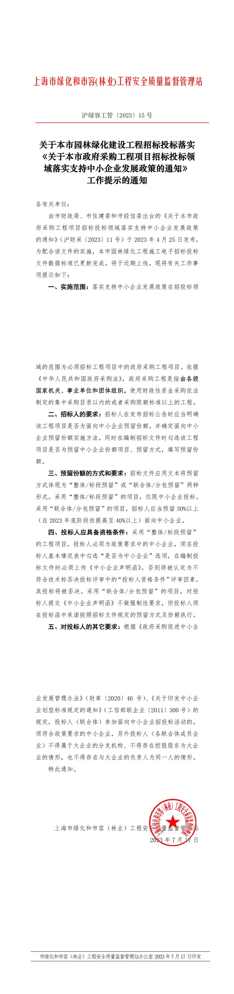 关于本市园林绿化建设工程招标投标落实《关于本市政府采购工程项目招标投标领域落实支持中小企业发展政策的通知》工作提示的通知【沪绿容工管〔2023〕15 号】