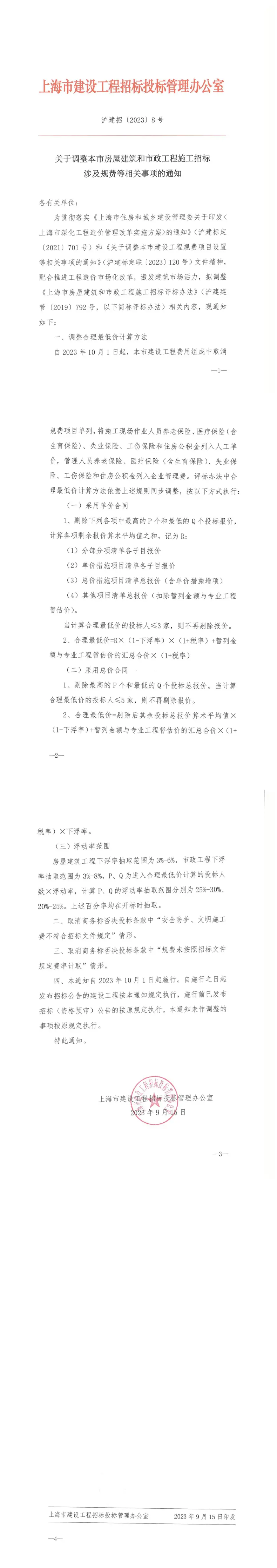关于调整本市房屋建筑和市政工程施工招标涉及规费等相关事项的通知【沪建招〔2023〕8号】