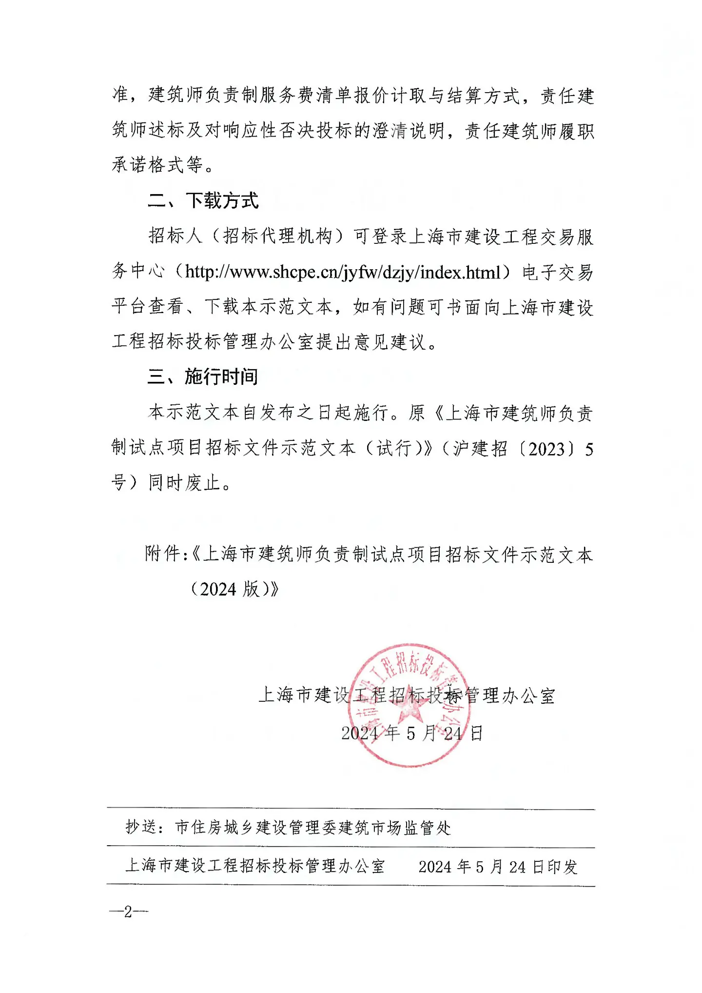 关于印发《上海市建筑师负责制试点项目招标文件示范文本(2024版)》的通知(沪建招〔2024〕5号)
